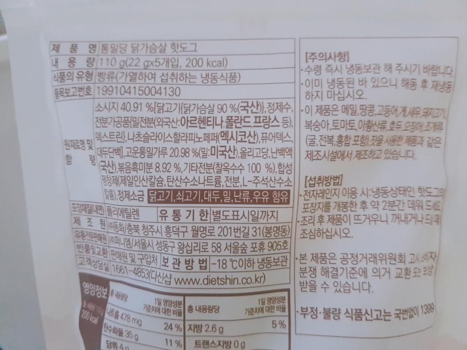 뒷면에 렌지에서 2분 돌리라고 했지만 1분도 충분해요. 빵은 통밀의 꺼끌거림이 마지막에 느껴지지만 전체적으로는 찰옥수수 전분 덕에 쫄깃해요. 닭가슴살 소세지는 일반 소세지의 부드러운 식감은 부족하지만 맛은 똑같아서 깜짝 놀랐어요. 재구매 의사 있어요.