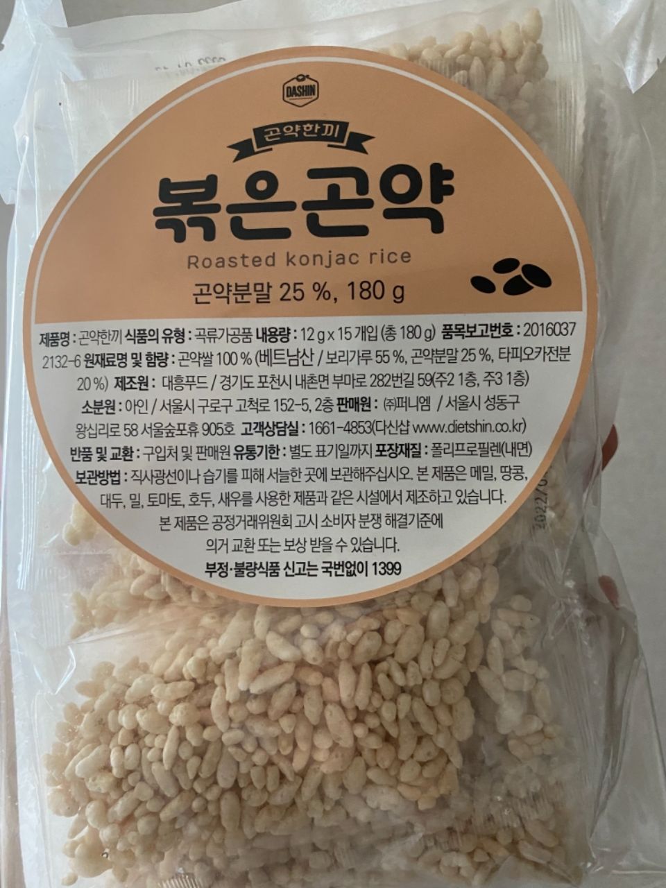 배고픔 참지 마세요! 100% 곤약쌀을 기름없이 볶아 바삭해요.