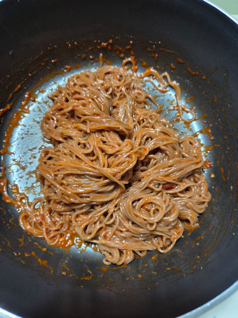 쫄깃한 흑미쌀면과 매콤새콤 과일숙성 소스