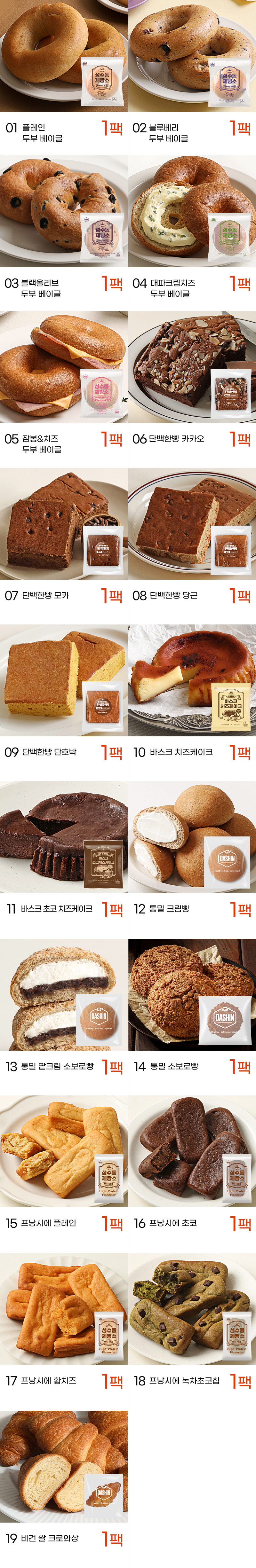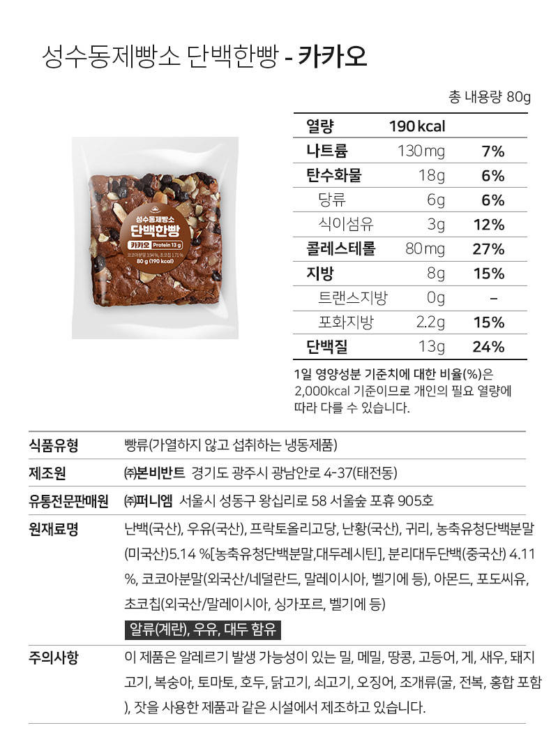 성수동제빵소 단백한빵 카카오:총 내용량 80 g (190 kcal) 나트륨 130 mg (7%) 탄수화물 18 g (6%) 당류 6 g (6%) 식이섬유 3 g (12%) 지방 8 g (15%) 트랜스지방 0 g 포화지방 2.2 g (15%) 콜레스테롤 80 mg (27%) 단백질 13 g (24%)난백(국산), 우유(국내산), 프락토올리고당, 난황(국산), 귀리, 농축유청단백분말, 분리대두단백, 코코아분말(네덜란드), 아몬드, 포도씨유, 초코칩(말레이시아)[설탕, 가공유지{경화참핵유, 팜유}, 코코아분말, 탈염유청, 대두레시틴]