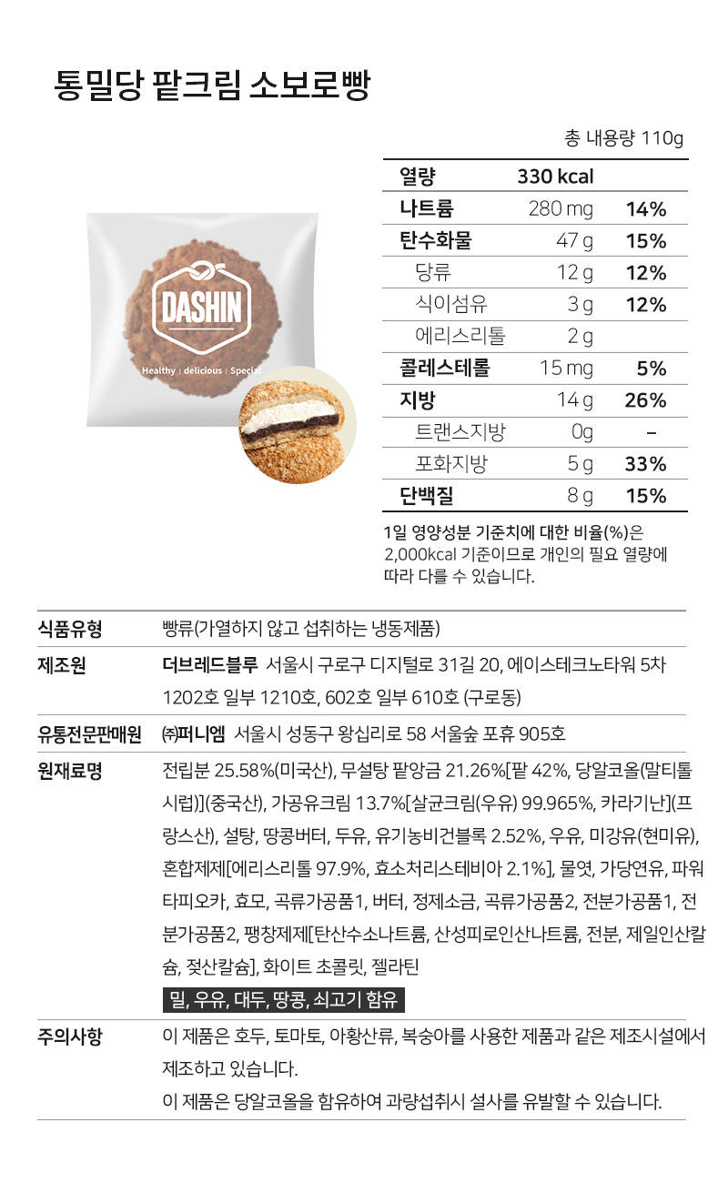 통밀당 팥크림 소보로빵:총 내용량 110 g (330 kcal) 나트륨 280 mg (14%) 탄수화물 47 g (15%) 당류 12 g (12%) 식이섬유 3 g (12%) 에리스리톨 2 g 지방 14 g (26%) 트랜스지방 0 g 포화지방 5 g (33%) 콜레스테롤 15 mg (5%) 단백질 8 g (15%)