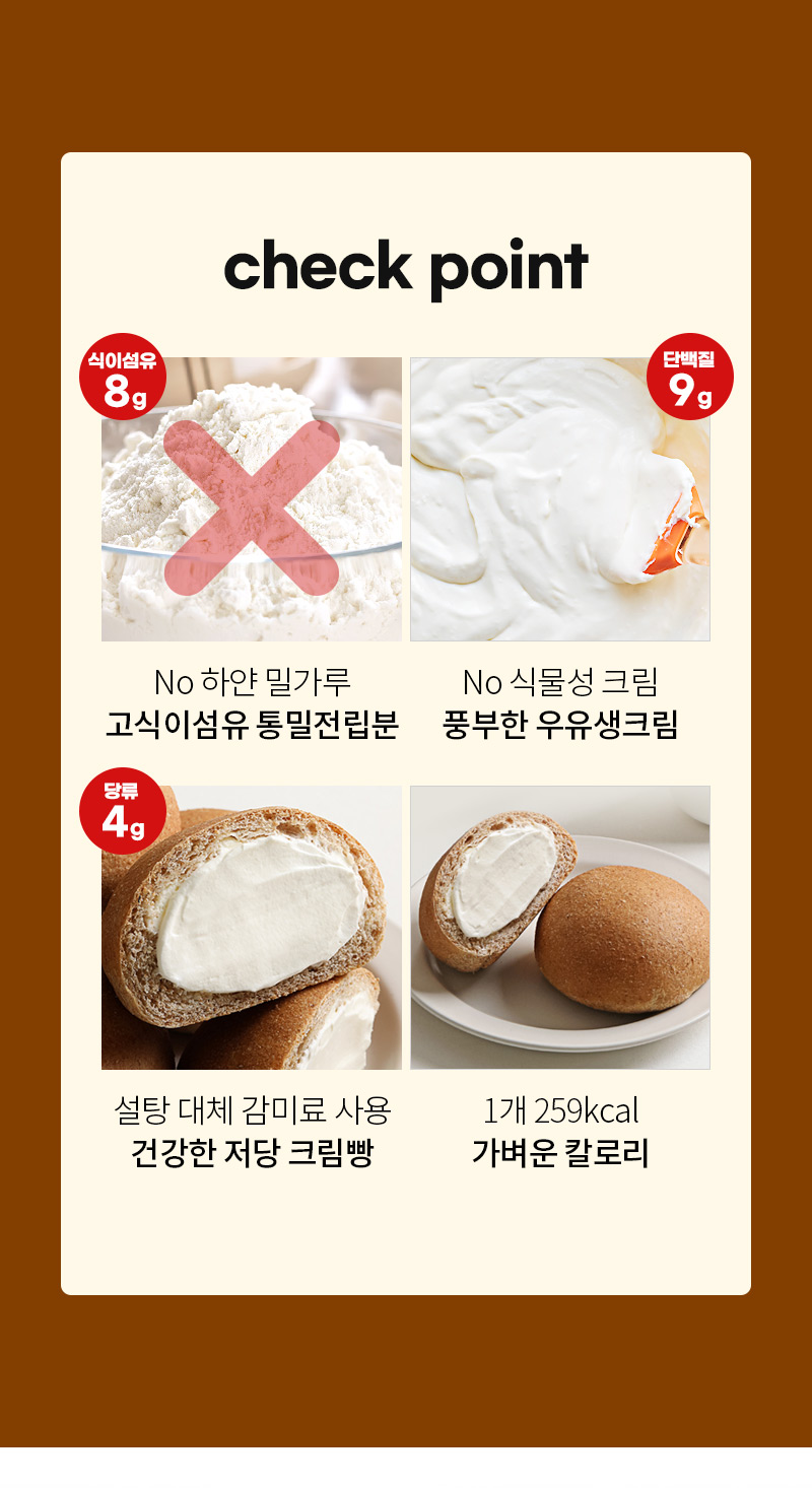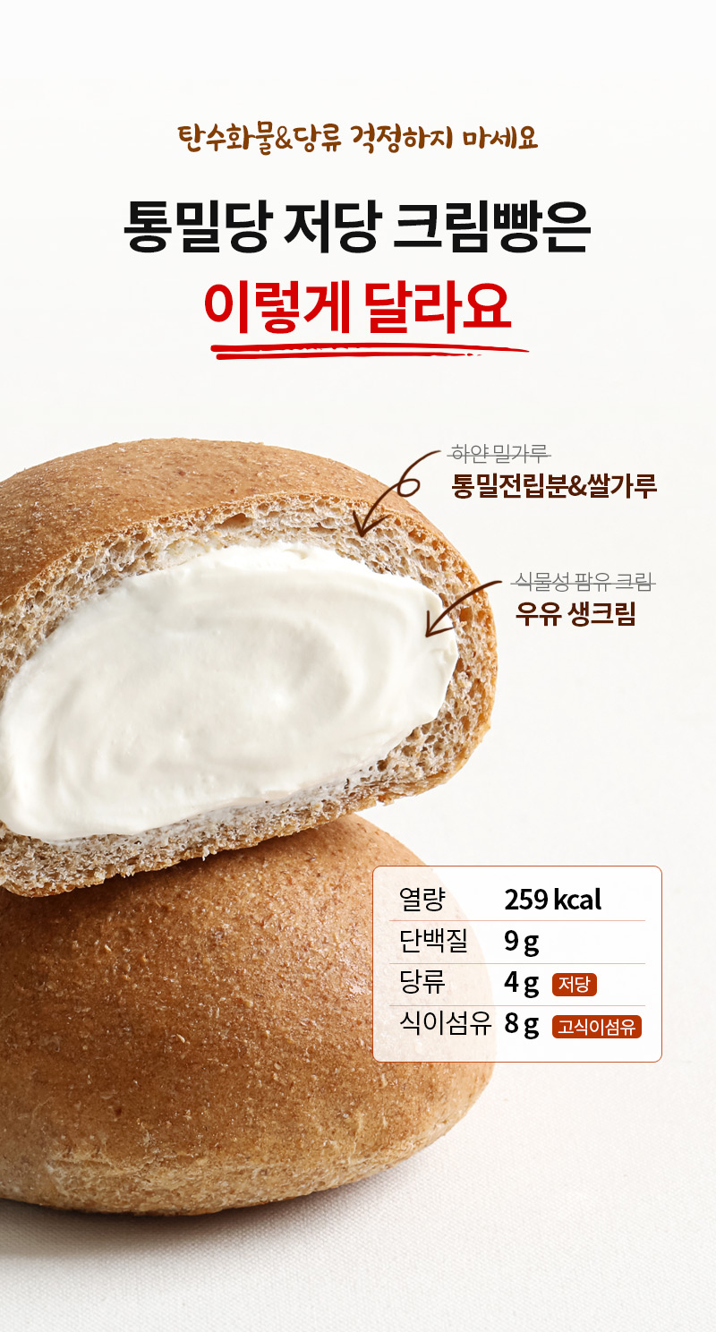 통밀당 크림빵:총 내용량 100 g (259 kcal) 나트륨 420 mg (21%) 탄수화물 40 g (12%) 당류 4 g (4%) 식이섬유 8 g (32%) 에리스리톨 5 g 지방 11 g (20%) 트랜스지방 0 g 포화지방 4.8 g (32%) 콜레스테롤 15 mg (5%) 단백질 9 g (16%)가공유크림 26.98%[살균크림(우유) 99.965%, 카라기난](프랑스산), 전립분 22.07%(미국산), 강력쌀가루[쌀(외국산), 글루텐(프랑스산)], 덱스트린, 혼합제제(변성전분, 설탕분말), 포도당], 우유, 미강유(현미유), 혼합제제[에리스리톨(감미료) 97.9%, 효소처리스테비아(감미료) 2.1%], 찹쌀가루, 밀가루, 가당연유, 효모, 버터, 정제소금, 곡류가공품, 전문가공품, 화이트초콜릿, 젤라틴 [밀, 우유, 대두, 쇠고기 함유]