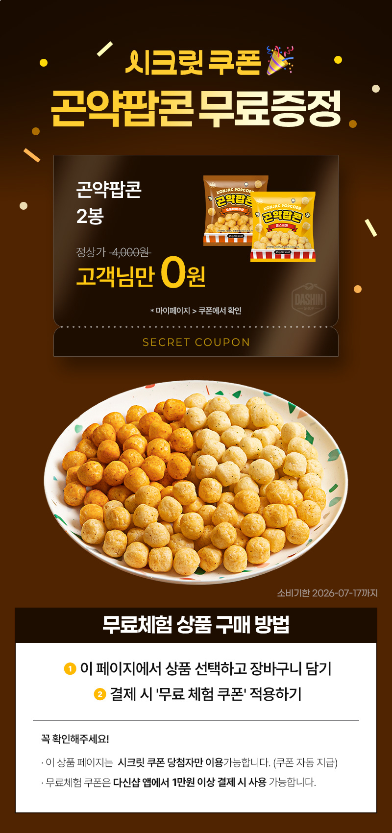 곤약팝콘 콘스프:총 내용량 25 g (97 kcal) 나트륨 100 mg (5%) 탄수화물 21 g (6%) 당류 1 g (1%) 식이섬유 2 g (8%) 지방 1 g (2%) 트랜스지방 0 g 포화지방 0 g (0%) 콜레스테롤 0 mg (0%) 단백질 2 g (4%)콘그릿츠(외국산:호주,브라질,러시아 등)42.24%,현미가루(국내산)21.32%,팜올레인유(말레이시아산),콘스프맛시즈닝11%[백설탕,포도당,정제소금(국내산),조제스위트콘파우더(뉴질랜드산)],곤약분말(중국산)7.33%,정제소금,d-토코페롤(혼합형) [ 알류,우유,대두함유]